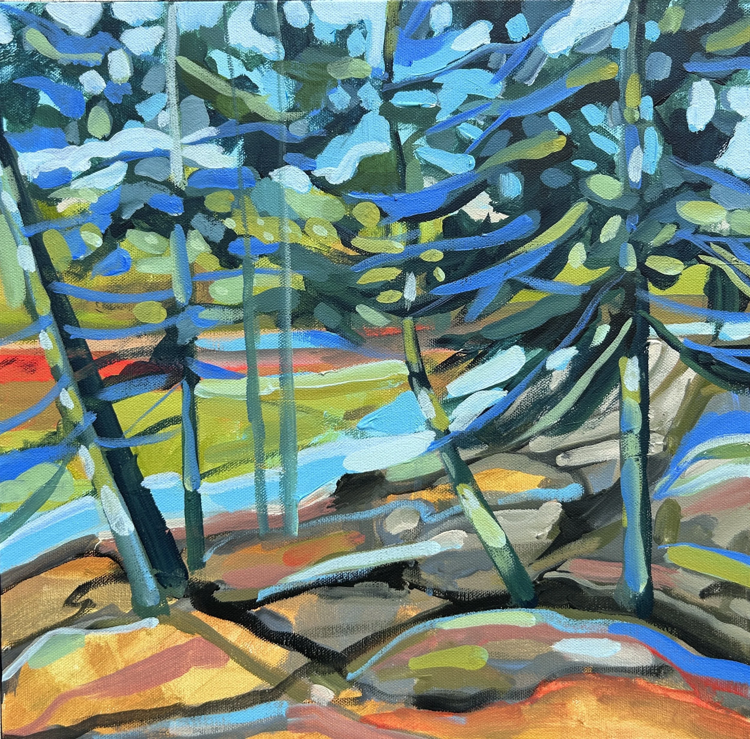 My current work follows in real time the change of seasons and the people and places around me. I am most interested in color and composition in all my work. The winters here are particularly long, and as a result, are productive for painting. My winter body of work has been primarily large-scale paintings of bare-branched trees, most of which were visible from my house or studio. In the warmer seasons, almost any subject matter is fair game; the chickens in my yard, lobstering gear on a dock or radishes from the garden.